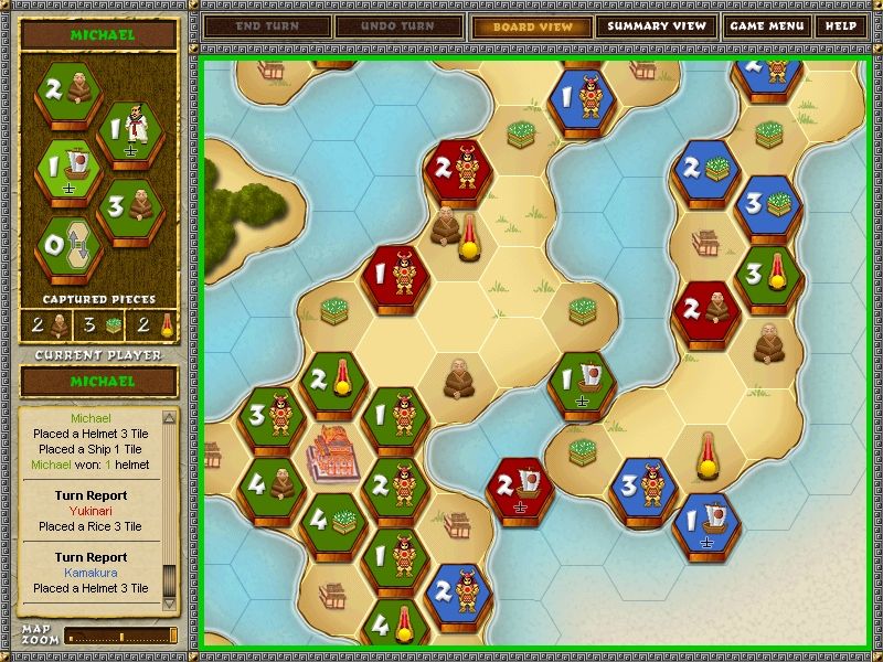Visually, Samurai retains the minimalist elegance of its board game roots. The hex grid is rendered cleanly with subtle textures that evoke parchment and rice paper, immersing players in a stylized vision of feudal Japan. Each caste icon—Buddha, helmet, rice sheaf—is crisp and easily distinguishable, ensuring that even on smaller screens you can quickly interpret the board state.