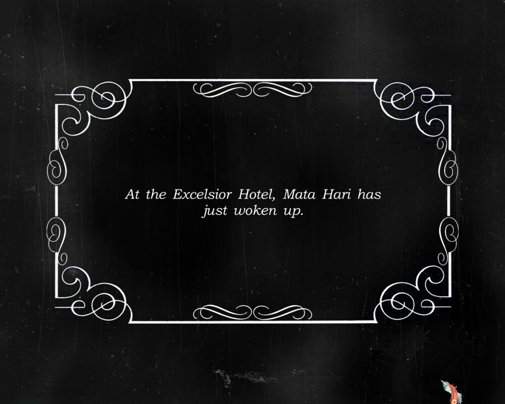Character portraits, including a stylized Mata Hari in her signature exotic garb, convey personality through expressive facial features and dynamic poses. NPCs range from suspicious officers to aristocratic gentlemen, each drawn with enough flair that they feel like distinct individuals rather than generic figures. Cutscenes are minimal but effectively serve as narrative bridges, rendered in the same polished painterly style for consistency.