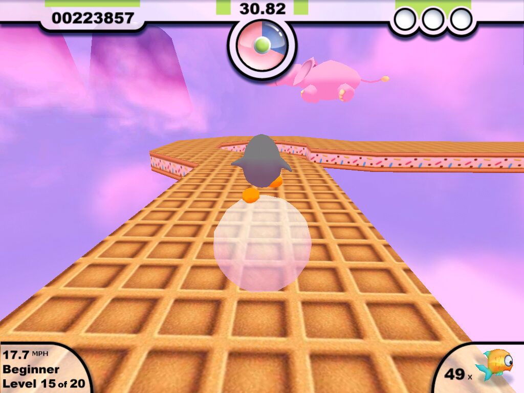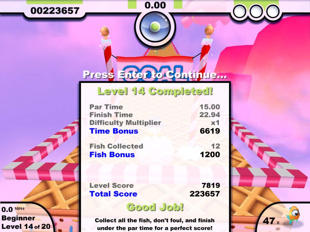 The time-limit system adds an exciting layer of strategy. Each level gives you a target duration, and the faster you finish, the more points you rack up. This creates a risk-reward dynamic: do you hug the edges to safely avoid barriers or cut corners aggressively to shave seconds off your time? Collecting fish scattered throughout the course further rewards exploration, encouraging players to veer off the optimal path for extra points.