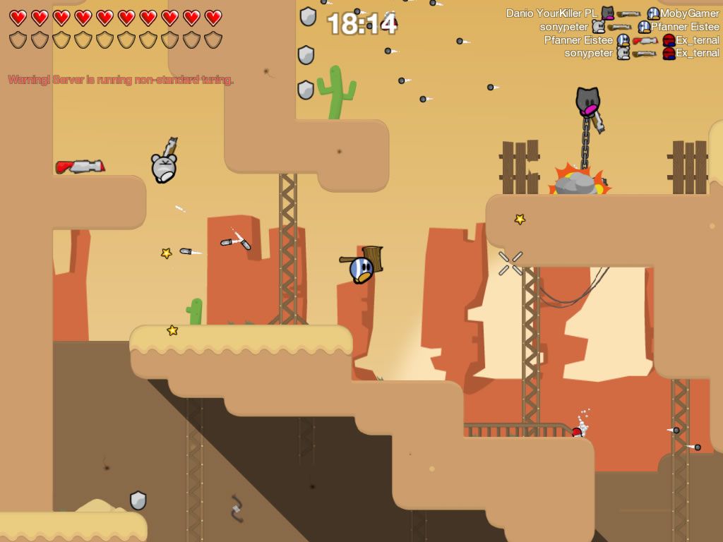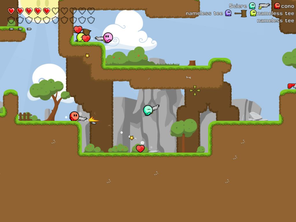 Teeworlds embraces a clean, 2D cartoon art style with vibrant colors and bold outlines. The low-poly aesthetic keeps visuals uncluttered, ensuring players can immediately spot foes, pickups, and hazards against varied backdrops. Whether you’re swinging through underground caverns or open-air arenas, each map boasts its own palette and thematic flair.