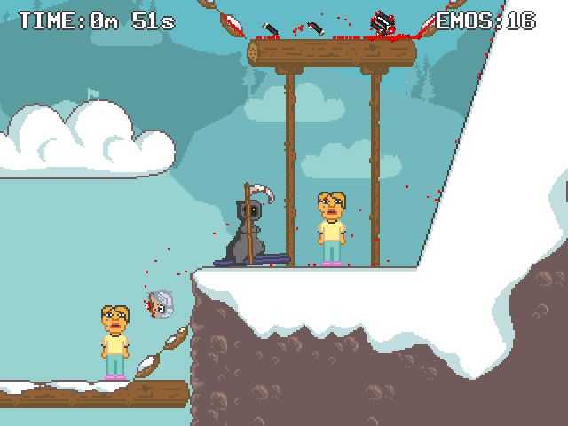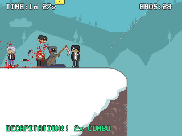 Animations run smoothly at a solid frame rate, even when dozens of emos are onscreen in a single combo. Death’s scythe swings feel weighty, and the physics of each jump and slide are finely tuned. Particle effects for jumps, dust trails, and impact splatters are crisp without being distracting, ensuring that the action remains clear and readable even during frenetic moments.