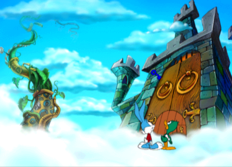 Once you locate a nursery-rhyme clue at the top of a stalk section, the game seamlessly transitions into a single-screen point-and-click adventure. Here, you must decipher Babs Bunny’s hints to identify the correct hot-spot among several animated objects. Finding the right item rewards you with a piece of a key, and assembling three key fragments brings you one step closer to snatching a fabled treasure from the mysterious giant’s lair.