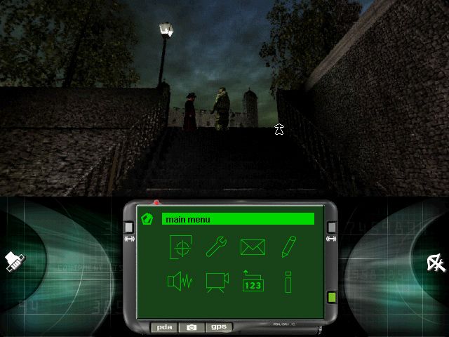 Traitors Gate places you in the shoes of Special Agent Raven in a first-person, node-based adventure that blends intricate puzzles with a stealthy infiltration mission. Much like Myst III, the game uses static 360-degree panoramas linked by smooth animations, allowing you to click through highly detailed environments rather than roam freely in real time. From the moment you begin, you’re given a PDA-style device that serves as your lifeline: it houses a camera, email system to communicate with headquarters, and logs your progress through the tower.