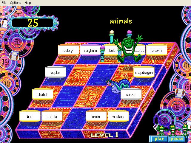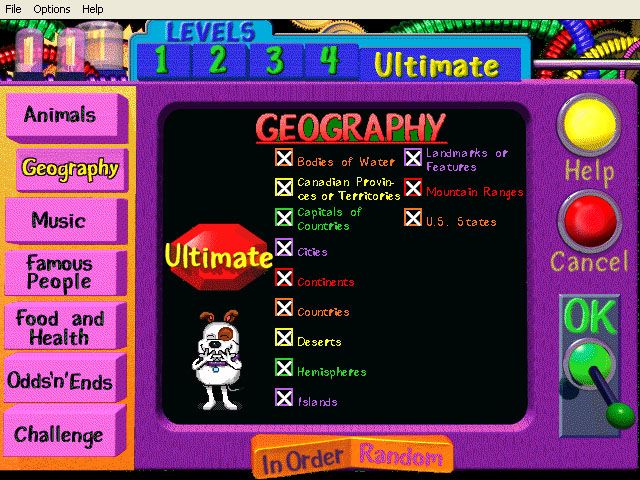Adding depth to the basic chase-and-eat mechanic are the game’s seven major trivia categories—Animals, Geography, Music, Famous People, Food & Health, Odds ’n’ Ends, and Challenge. You can also customize which subcategories appear on each board, giving you control over whether you want to brush up on capitals or bypass sports trivia altogether. The combination of broad topics and fine-tunable subcategories ensures that Trivia Munchers Deluxe stays fresh even after dozens of rounds.