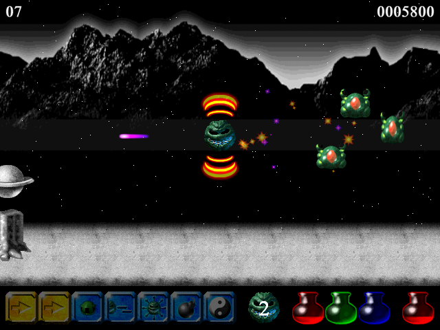 Wizball’s gameplay remains as inventive today as it was in its original incarnation. You pilot a boundless green orb—the wizard in enchanted guise—across three stacked horizontal layers, bouncing through portals and dispatching sprite-like enemies with precision shots. Each contact with an enemy triggers a dazzling explosion of light, but this same collision can cost you a life if you’re careless. Mastering the orb’s momentum and timing your jumps between levels quickly becomes second nature, yet the learning curve stays engagingly steep.
