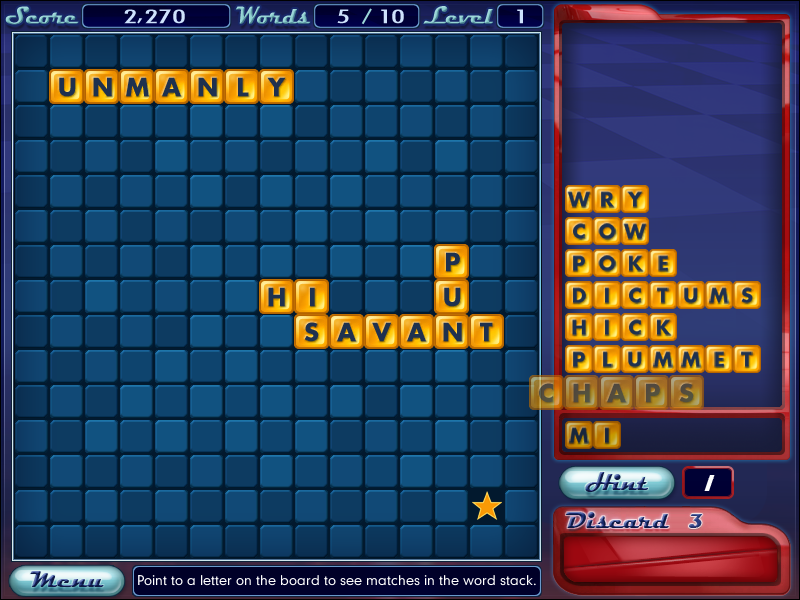 Word Slinger puts a fresh spin on classic solitaire word puzzles by giving you a 15×15 board and a rotating list of 2–8-letter words to place horizontally or vertically. Each level challenges you to place or form a set target number of words before you can advance. In Strategy mode, you can take all the time you need to think through your placements, while Speed mode forces you to race against the clock as new words fill your list. Once you’ve hit the target word count, you’re free to keep playing until the board is full, allowing you to maximize your points and perfect your strategy.
