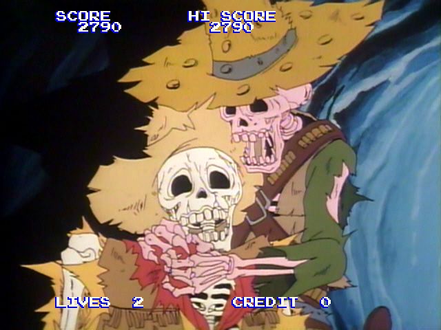 Colors pop with a richness unseen in most contemporaneous arcade titles. The animated sprites are buttery smooth in motion, lending a sense of weight to every gun draw, reload, and death tumble. That said, being an analog medium there are occasional flickers, minor video noise, or slight stutters as the disc seeks between tracks—quirks that purists will find endearing, but newcomers might mistake for glitches.