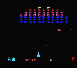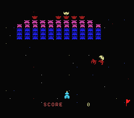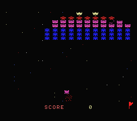 When enemies break formation, their individual flight paths are smooth and well-drawn, giving each craft distinct personality. Explosions are rendered with satisfying bursts of light and flicker, enhancing each successful shot with a visceral punch. The vibrant color palette—especially during level transitions marked by the flags—adds flair and prevents the visuals from becoming monotonous.