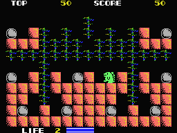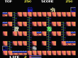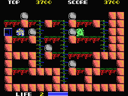 Adding to the challenge, a variety of monsters patrol each stage. While Godzilla is powerful, he is not invincible; contact with a monster will cost you a life and force you to restart the level. This element of risk and timing keeps each run tense, as you balance clearing rocks quickly with avoiding enemy patrol routes. As you progress through the 49 levels, the puzzles become more intricate, introducing multi-screen layouts and clever trap sequences that will test even seasoned platforming fans.
