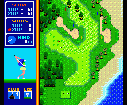 The top-down perspective remains classic, but the MSX2 hardware allows for smoother animations and a broader palette. Clubs swing fluidly, and the ball’s flight path is easy to track even against complex backgrounds. The overhead view also dynamically shifts to highlight important course features, such as a raised green or a hidden bunker, giving you the visual cues you need to plan each stroke.