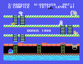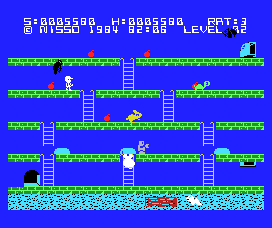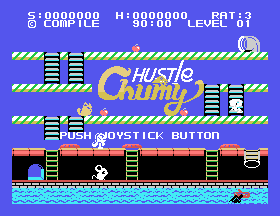 Hustle! Chumy places you squarely in the role of a resourceful sewer mouse on a quest for cheese, and its core gameplay loop is both straightforward and satisfying. Using the cursor keys to navigate a maze of ladders and platforms, you constantly balance speed, precision, and timing. Jumping with X allows Chumy to clear gaps and evade enemies, while the C key lets you hurl cans at approaching threats. The controls are responsive from the first session, giving you the confidence to attempt more daring maneuvers as you progress.