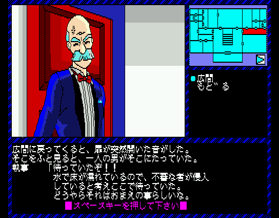 Movement is dual-layered. A mansion map to the right of the screen gives you an overhead view of your current floor, while a menu lets you select specific rooms or hallways to traverse. This hybrid approach means you must juggle spatial awareness with stealth tactics, as a wrong choice can land Minoru face-to-face with the mansion’s lone guard. When you’re caught, it’s instant game over, raising the stakes of each decision.