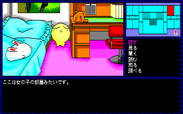 Intruder: Sakura Yashiki no Tansaku places you in the shoes of Minoru Nakagawa, relying on a classic verb-command interface that brings back the charm of old-school adventure titles. Instead of direct point-and-click controls, you choose actions—“look,” “use,” “open,” and more—from a menu, then target objects or areas in the environment. This system encourages careful planning: every command could draw you closer to discovery or help you slip past a patrolling maid.