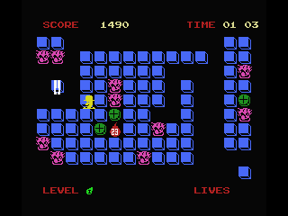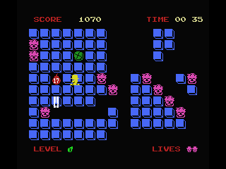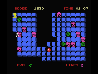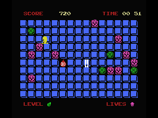 Alongside the disappearing tiles, green rolling dam-stone objects are peppered across the board as optional bonuses. Chasing these bonus items adds an extra layer of risk-reward tension, since detours can lead you straight into the path of purple monsters or the patrolling Man With The Hat. Timing your moves and planning an efficient route across the board become essential skills—especially in later levels where missing a single tile means back to square one.