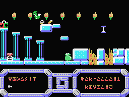 Visually, Temptations leans into the classic Spanish flick-screen aesthetic, with richly colored, hand-drawn backdrops that depict a haunted medieval village. Each screen feels like its own diorama, packed with stone arches, wooden scaffolding, and shadowy corners where demons lurk. The pixel art style, while simple by modern standards, exudes charm and personality in every sprite.