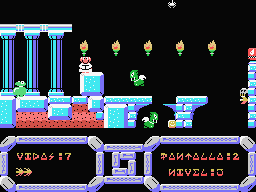From the moment you take control of Noni, Temptations challenges you with its tight flick-screen platforming and slippery inertia. Movement is handled via the ARROW KEYS or a joystick, and the monk’s forward momentum often carries him past your intended landing spot. Mastering this inertia is critical: mistime a jump and you’ll slide right into a pit of demons or hazardous terrain. This mechanic transforms each screen into a puzzle of momentum and precision.