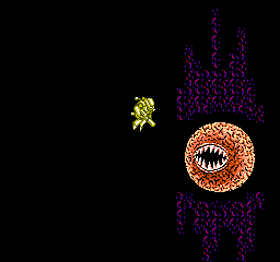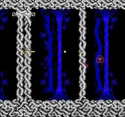 Considering the NES hardware, Abadox impresses with its grotesquely detailed organic environments. Background layers depict oozing veins and shifting tissue walls in varying shades of red, purple and sickly green, creating an atmosphere of alien dread. The palette feels cohesive—every texture, from bone-like ridges to slimy membranes, reinforces the impression of battling inside a living organism.
