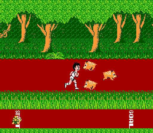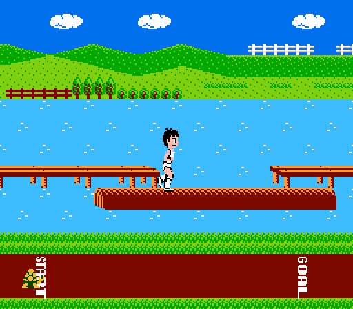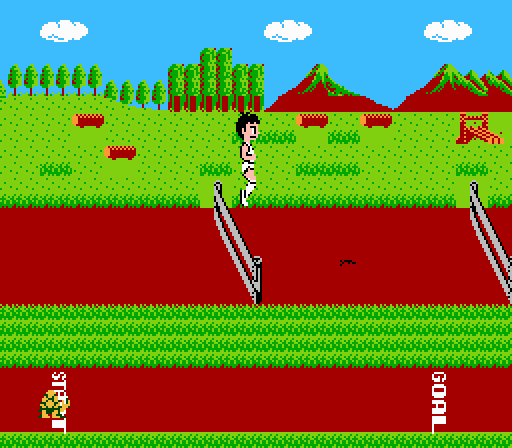 On an 8-bit console, Athletic World’s visuals strike a pleasing balance between clarity and charm. The Power Pad interface is rendered as a simple stadium floor, but the background environments change to reflect each event, from bright track-and-field arenas to wooded riverbanks for rafting. Color palettes remain vivid, ensuring that obstacles and course markers always stand out.