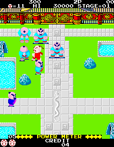 Though rooted in classic arcade heritage, Chinese Hero’s visuals remain crisp and colorful. The sprite work for Jacky, Lee, and a host of monsters—from skeleton warriors to demonic beasts—is surprisingly detailed for its era. Each castle environment boasts its own palette: dingy stone corridors, torch-lit halls, and eerie throne rooms that help distinguish the eight worlds you’ll conquer.