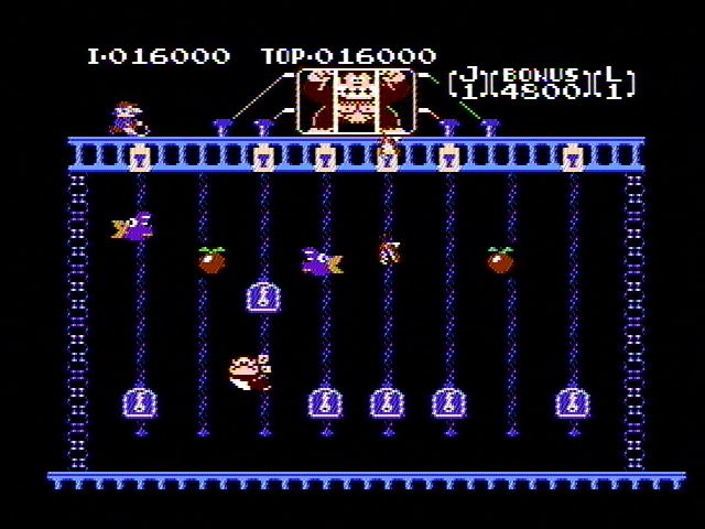 Donkey Kong Junior introduces a slightly more varied color palette, reflecting the lush jungle settings and mechanical cages that define its stages. The vines sway with fluid animation, and Junior himself moves with satisfying responsiveness that belies the system’s limitations. While the resolution is lower than the arcade originals, the art direction ensures each level is instantly recognizable and visually appealing.