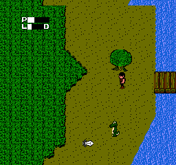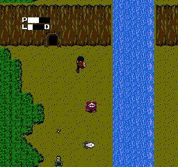 Visually, Erunaaku No Zaihou opts for a clean, retro overhead view reminiscent of early console classics. The pixel art is crisp and colorful, with distinct character sprites that stand out clearly against the winding riverbanks and dense foliage. Environments are simple but evocative—verdant green river edges contrast nicely with the darker, shadowy waters beneath.