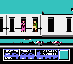 Freedom Force puts you in the crosshairs of the Nintendo Zapper from the very first shot. As Rad Rex (or Manic Jackson in two-player mode), you’re tasked with mowing down waves of Bagmen across five distinct stages: the aeroplane, the gangway, the airport terminal, the streets and finally the guerrilla hideout. Enemies can pop up anywhere – through doors, windows or behind crates – demanding sharp reflexes and split-second decisions on whether to pull the trigger or hold fire to avoid hitting civilians or hostages.