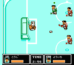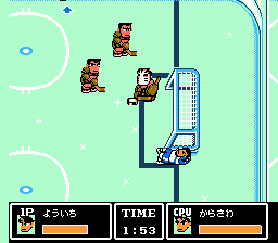 Visually, Ike Ike! Nekketsu Hockey-bu embraces a vibrant, cartoon-inspired aesthetic that perfectly complements its wacky gameplay. Character sprites are bold and expressive, with exaggerated animations that highlight every punch, slash, and spinning kick. The rink itself is framed by lively cheering crowds and colorful sponsor banners that nod to classic arcade sports games.