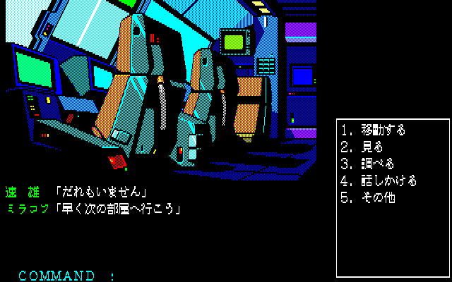 Jesus: Kyōfu no Bio-Monster adopts a classic Japanese adventure-game structure, putting players in the shoes of pilot Hayao Musou as they explore Space Lab Jesus and beyond. Each area is presented through a static but detailed image, paired with context-sensitive commands that allow for examination, item use, dialogue, and movement. This point-and-click approach keeps the focus on atmosphere and narrative rather than reflexes, making every decision feel deliberate and weighty.