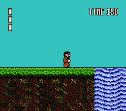 UI elements like the scroll-based life meter, score counter, and quiz prompts are cleanly integrated at the top of the screen, ensuring you’re never left guessing about your status. While animations are relatively stiff—typical of the NES period—the charming character poses and simple water-ball and fruit-throwing effects give each adventure its own visual identity.