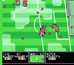 Character sprites are larger and more expressive, with Kunio’s trademark scowl and flailing fists vividly portrayed. Animations for kicks, punches, and celebratory poses are smooth and packed with personality, making every successful foul and diving header feel extra satisfying. Even the referees get in on the action, reacting to rough play with exasperated gestures and occasional ejections.