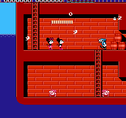 Built on the Nintendo Entertainment System’s 8-bit hardware, Mickey Mousecapade showcases bright, cheerful palettes that capture Disney’s cartoon charm within pixel constraints. Mickey and Minnie sprites are instantly recognizable, their animations smooth enough to express personality—Minnie twirls when idle and Mickey leaps with a spirited pose. Background elements shift dramatically from the warped mirrors of the fun house to rolling waves at the seaside, giving each stage a distinct look.