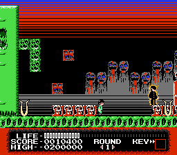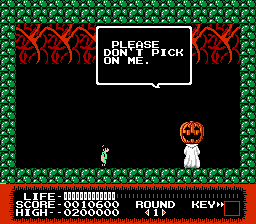Visually, Monster Party embraces the limitations of the NES era and turns them into a colorful horror carnival. Sprites are chunky and expressive, with each monster sporting exaggerated features—bulging eyes, snarling maws, and comical proportions—that ensure no two foes feel visually redundant. Mark and Bert’s fused gargoyle form is especially memorable, rendered with a dark green palette and detailed wings that flap in midair.