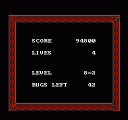 The built-in status report is a welcome feature for completionists. At any time you can check how many bugs remain on the current stage, which adds an optional scavenger-hunt element. Some enemies drop hearts for extra lives, so aggressive play is often rewarded. In the final level you’ll also search for a key card to breach Ronnie’s lair, injecting a brief adventure-puzzle sequence amid the hammer-swings.