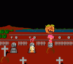 The backgrounds are richly detailed for an 8-bit era title—graveyard tombstones tilt at jaunty angles, mansion hallways boast flickering candelabras, and the pagoda stage features ornate rooftops adorned with lanterns. Clever parallax scrolling adds depth to each environment, making you feel immersed in this strange, kitschy world. On the technical side, frame rates stay consistent even when the screen fills with enemies, ensuring smooth gameplay.