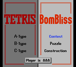 BomBliss itself breaks down into Contest, Puzzle, and Construction modes. Contest tracks your efficiency across preset fields, rewarding minimalist play with top-three leaderboards. Puzzle challenges you to clear a specific scenario with a fixed piece sequence, demanding foresight and planning. Construction hands you the tools to forge your own deadly layouts, sharing custom challenges with friends. Both halves of this cartridge come together to provide hours of replay value, especially when you invite a rival for a split-screen showdown in regular Tetris.