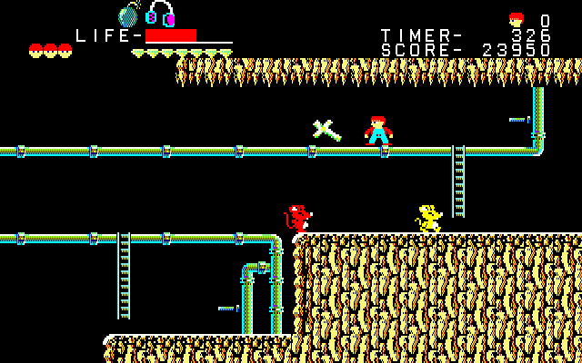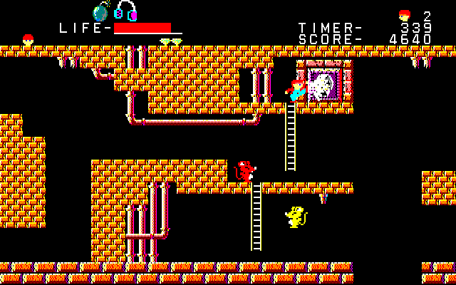 Enemy designs are equally memorable: scuttling rats, grinning skeletons, and stern-faced Fratelli goons all come to life with clear, readable animations. The game’s color palette leverages the Famicom’s limited capabilities by using earthy browns and muted greens to evoke an underground atmosphere, while occasional splashes of red or blue highlight interactive elements like doors or collectible diamonds.