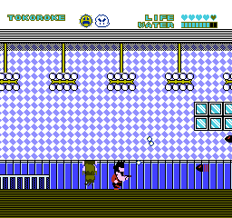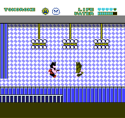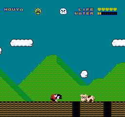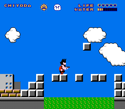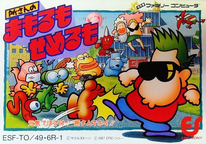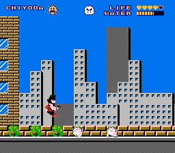 Tokoro-san no Mamoru mo Semeru mo delivers classic side-scrolling jump-and-run action reminiscent of arcade titles from decades past. You guide Japanese celebrity Tokoro-san across rooftops, through alleyways, and into suburban homes, armed solely with a water pistol. The controls are straightforward: run, jump, and fire, making it immediately accessible to newcomers while still offering deeper tactics for veterans.