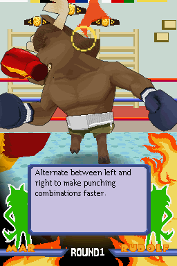 Animal Boxing offers a fresh twist on handheld sports games by having you hold your Nintendo DS upside down, immediately setting the stage for a unique control scheme. The entire right half of the DS becomes your punching zone: tap to throw jabs, swipe horizontally for hooks, and swipe upwards when you’re ready to land an uppercut. This intuitive use of the touch screen feels surprisingly natural after a brief adjustment period, and it allows for a satisfying variety of offensive moves.