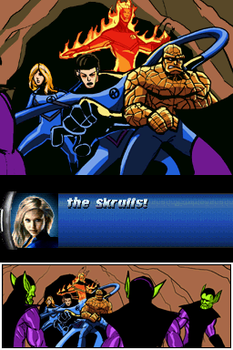 On the DS hardware, Rise of the Silver Surfer delivers colorful, cartoon-inspired visuals that capture the comic book essence of the Fantastic Four. Character sprites are well-drawn, with distinct silhouettes for each hero and recognizable animations for abilities like Reed’s elastic strikes or Sue’s hovering shields. Backgrounds switch between alien landscapes, Skrull outposts, and modern cityscapes, each populated with enough detail to feel unique without overcrowding the small screens.