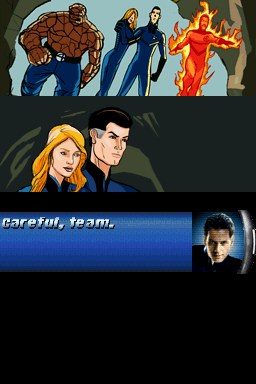 Story progression is delivered through occasional on-screen text, environmental cues, and brief image panels rather than fully voiced or animated cutscenes. While this economical presentation may feel sparse to those seeking cinematic storytelling, it keeps players focused on the action and allows for quick restarts after defeats. Key moments—like the first appearance of the Silver Surfer—are given more visual flair, heightening their impact even on the DS’s modest display.