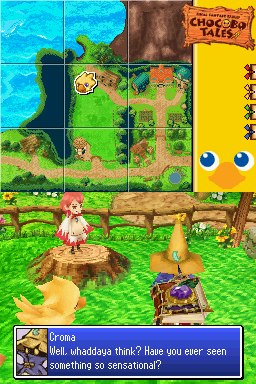 Visually, Chocobo Tales embraces the DS’s strengths, blending vibrant 2D sprites with simple 3D backgrounds. The overworld map is rendered in a bright, cartoony palette that evokes the cheerful atmosphere of classic Final Fantasy spin-offs. Chocobo and character sprite animations are smooth and expressive, giving life to idle poses, victory dances, and puzzle interactions without taxing the handheld’s hardware.