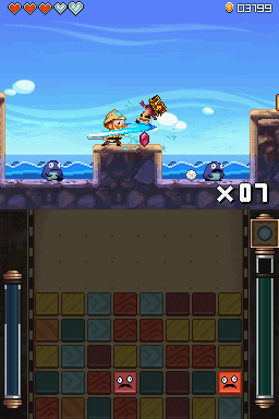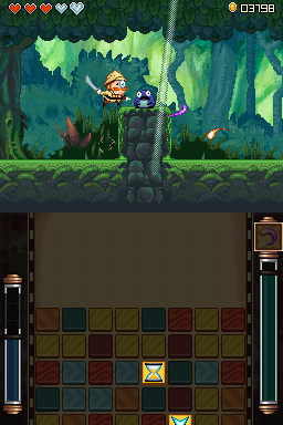Defeating foes in the action realm isn’t the end of the encounter—knock them down, and they drop into the Puzzle Realm on the touch screen. There, the game transforms into a lively match-three challenge reminiscent of Tetris Attack. You’ll rotate and align colored block-enemy hybrids to clear them before they ascend back up and rejoin Hatsworth upstairs, adding a constant tension to the dual-screen interplay.