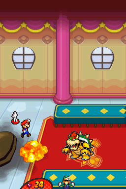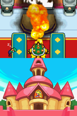 Character sprites are charmingly expressive. Mario and Luigi’s exaggerated eyes and cheeky animations inject humor into every attack and idle animation. Bowser himself is a real standout: his scale, horns, and layered shell are brimming with personality, whether he’s rubbing his stomach or unleashing a flame attack. The DS’s dual-screen format also shines during larger-than-life boss battles or comedic cutscenes, where dialog bubbles and animations span both displays.