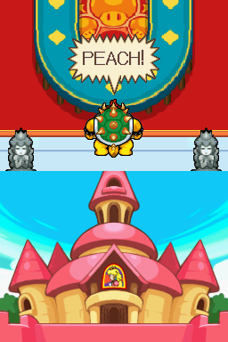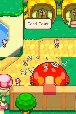 On the Nintendo DS, Bowser’s Inside Story pushes the hardware to its limit with colorful, highly detailed backgrounds and fluid animations. Inside Bowser, walls pulse and move organically, while gooey textures and animated Blorbs pop off the screen. Outside, the Mushroom Kingdom bustles with life—Toad Town’s spires and warp pipes are rendered with clarity, and Bowser stomping across the overworld feels weighty thanks to dynamic shadows.