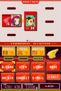 On the graphical front, Mega Man Star Force: Leo leverages the DS hardware to present crisp 3D environments and lively sprite work. The real-world locales—city streets, parks, and labs—are rendered in bright, blocky 3D on the bottom screen, while the top screen’s 3D battlefield provides depth and perspective to each encounter. Though not pushing the DS to its absolute limits, the game’s visuals maintain a clean, anime-inspired aesthetic that complements its sci-fi tone.