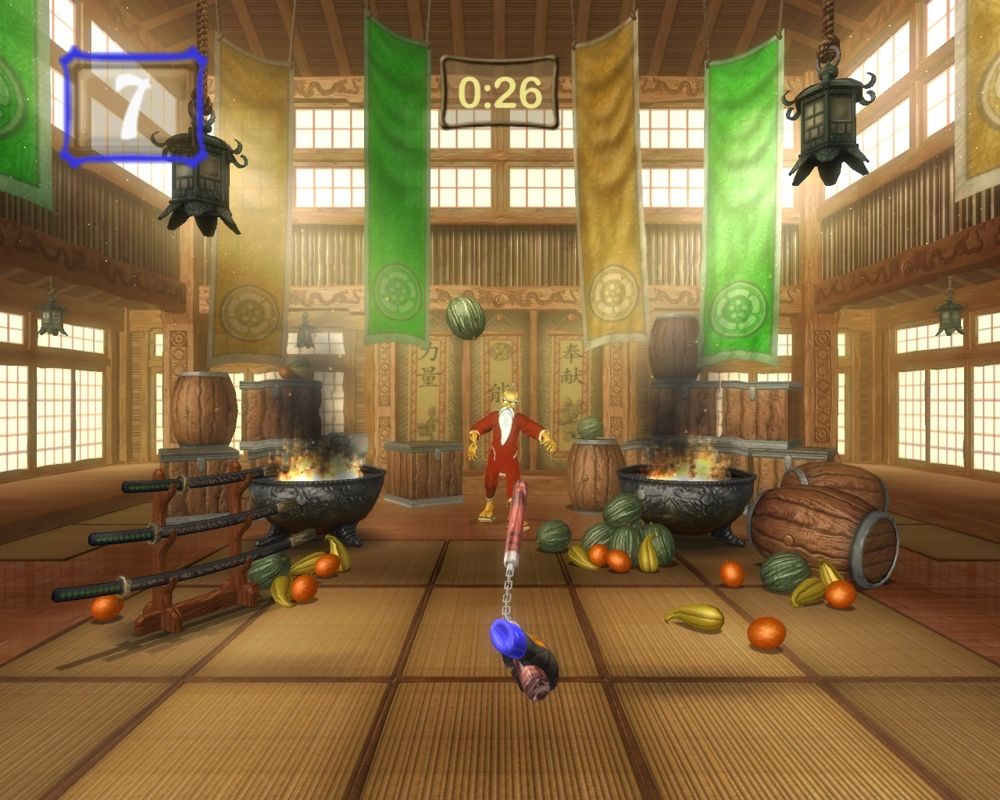 The weapon training exercises—tossing shuriken at moving targets, slicing through airborne projectiles with a samurai sword, and keeping a flurry of nunchaku in the air—ramp up the difficulty in predictable yet satisfying increments. As you progress, the timing windows narrow and the patterns become less forgiving, striking a balance between frustration and mastery that fans of rhythm-action hybrids will appreciate. Controls are tight and responsive, making you feel in true control of every toss, catch, and slice.