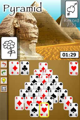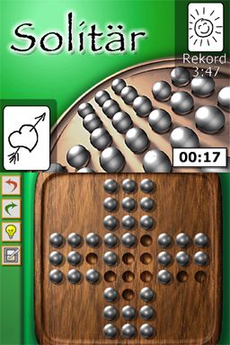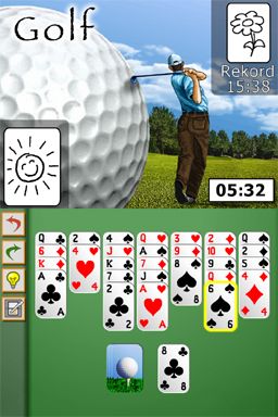 Graphically, Solitär keeps things clean and straightforward. The card designs are crisp, with clear suits and indices that are easy to read on the DS’s dual screens. Backgrounds are simple—typically a felt-like table or muted colors—so your focus stays on the gameplay rather than on flashy visuals. This minimalist approach works well for a puzzle card game, ensuring clarity even during fast-paced shuffles and moves.