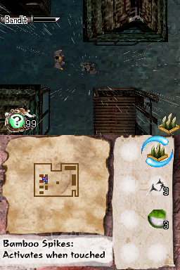 The dual-screen functionality of the Nintendo DS is put to good use. The upper screen displays your character, surrounding terrain, and enemy movements, while the lower touchscreen shows a real-time map and allows quick item selection. Your chi meter glows ominously whenever guards draw near or catch a scent of intruder activity, prompting you to slip into the shadows or dispatch foes before they raise the alarm.