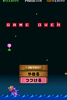 Visually, Tingle’s Balloon Fight DS captures the retro pixel aesthetic while showcasing the DS’s palette and sprite capabilities. Tingle himself is rendered in vibrant greens and reds, with his trademark heart-shaped nose and whimsical expressions brought to life in crisp animations. Enemy fish and birds maintain their simple, charming designs, moving smoothly even when multiples crowd the screen.