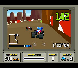 Stunt Race FX was a true visual showcase for the Super Nintendo, powered by an enhanced SuperFX chip that rendered fully polygonal cars and courses for the first time on the system. Gone are the flat, Mode 7–style racetracks; instead, you’re presented with three-dimensional circuits complete with undulating gradients and dynamic elevation changes. These polygonal landscapes open the door to imaginative obstacle placement—steep drops, looping ramps, and twisting bridges—that simply wouldn’t be possible in a “flat” racer.